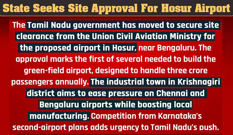 - The Tamil Nadu government has submitted a site clearance application to the Ministry of Civil Aviation for establishing an airport at Hosur.