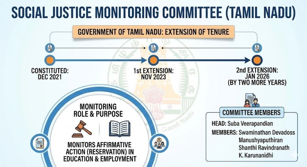 - The Tamil Nadu government extended the tenure of the Social Justice Monitoring Committee by two more years.