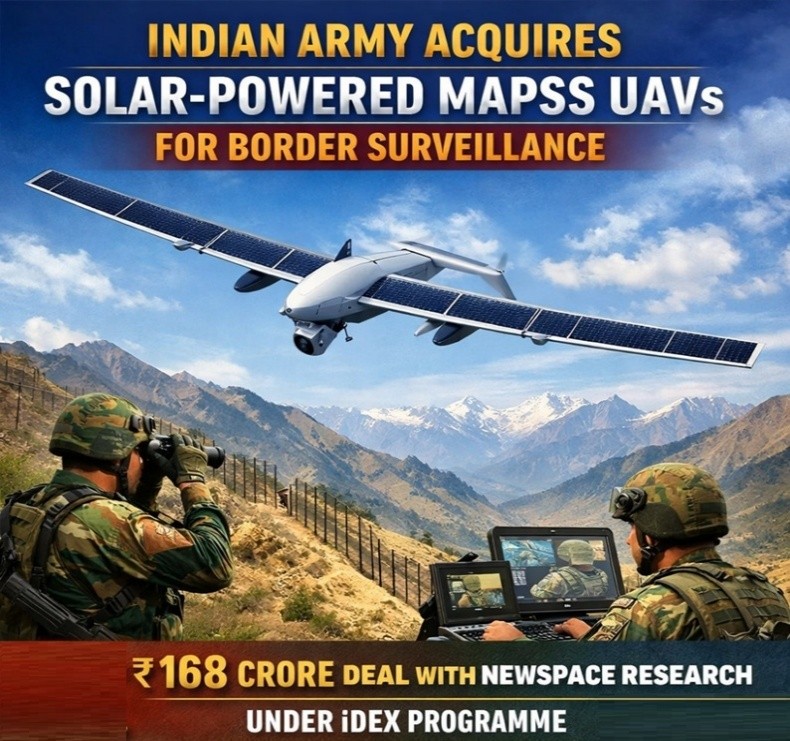 The Indian Army signed a ₹168 crore contract for the Medium Altitude Persistent Surveillance System (MAPSS), India’s first solar-powered surveillance drone.