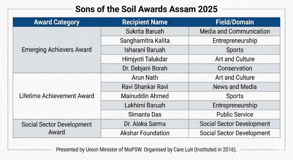 The Union Minister of Ports, Shipping and Waterways (MoPSW) conferred the Sons of the Soil Emerging Achievers Award at the 5th Biennial Son of the Soil Awards Assam 2025.
