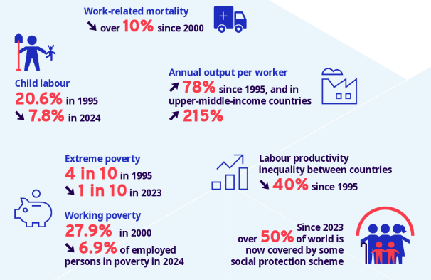 - Global child labour (age 5–14) declined from 250 million in 1995 to 106 million in 2024.