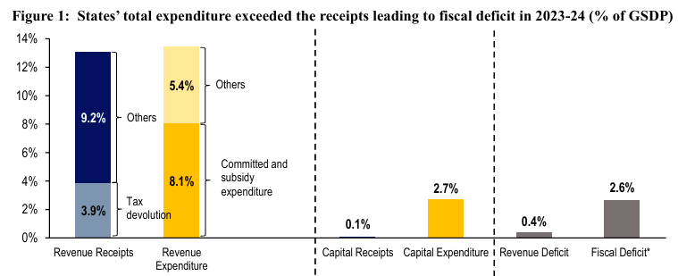 In 2023-24, states collectively spent 62% of their revenue receipts on interest payments, salaries, pensions, and subsidies.