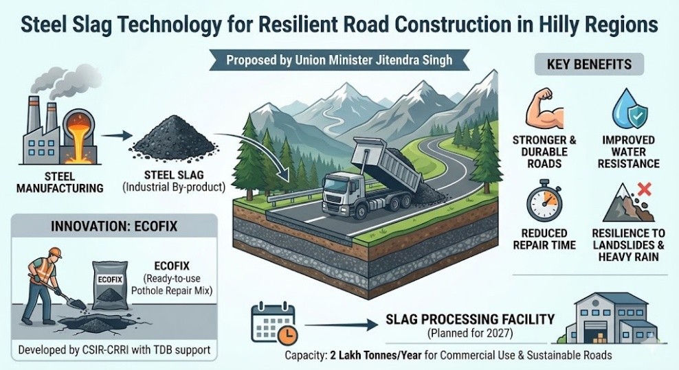 Union Minister Jitendra Singh proposed using steel slag for road construction in hilly and Himalayan regions.