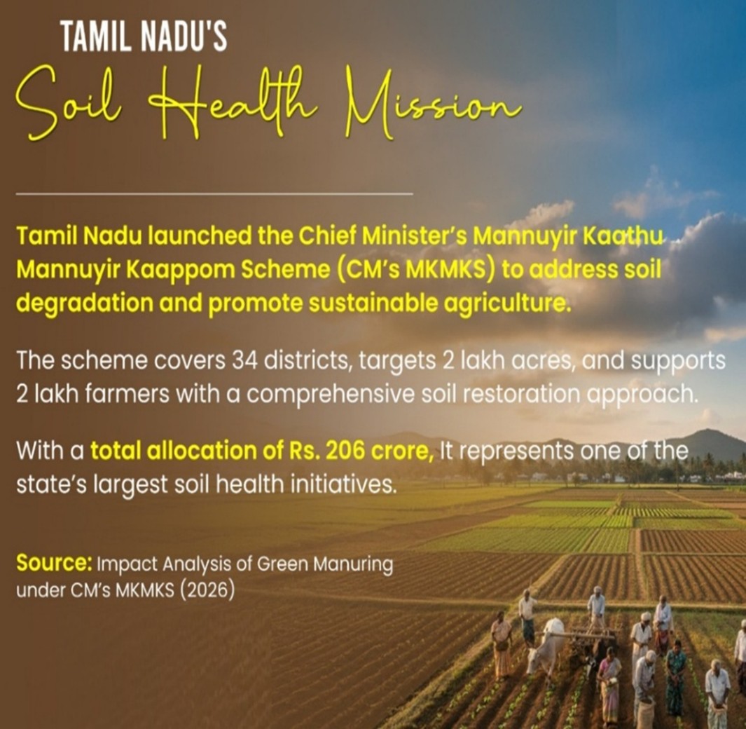 - The Government of Tamil Nadu is strengthening soil fertility through the Soil Health and Fertility Scheme with a budget of about ₹206 crore.