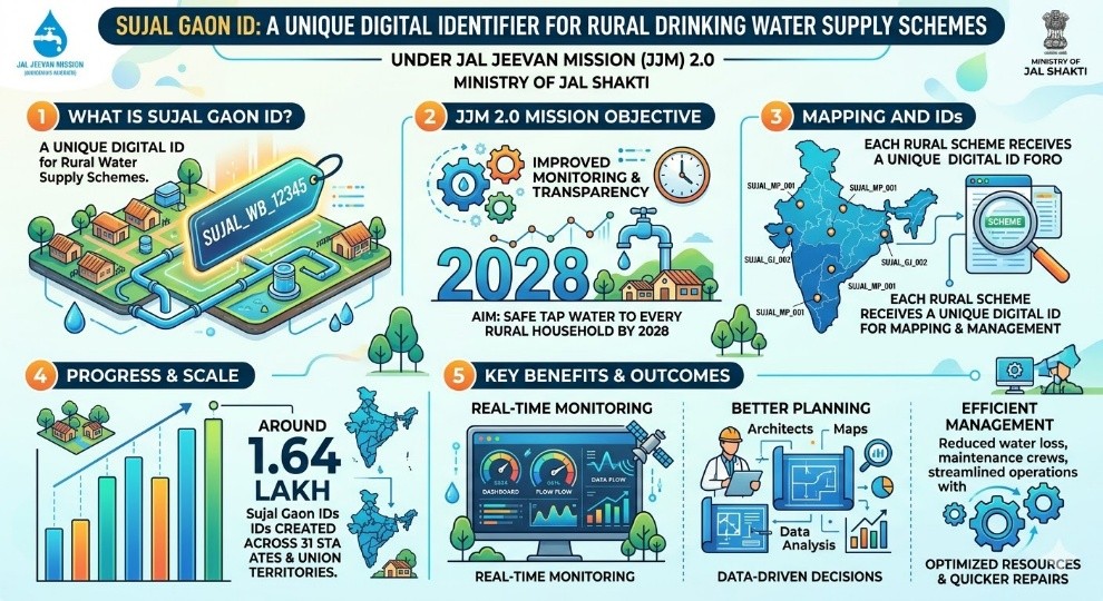 - The Ministry of Jal Shakti launched Sujal Gaon ID, a unique digital identifier for rural drinking water supply schemes.