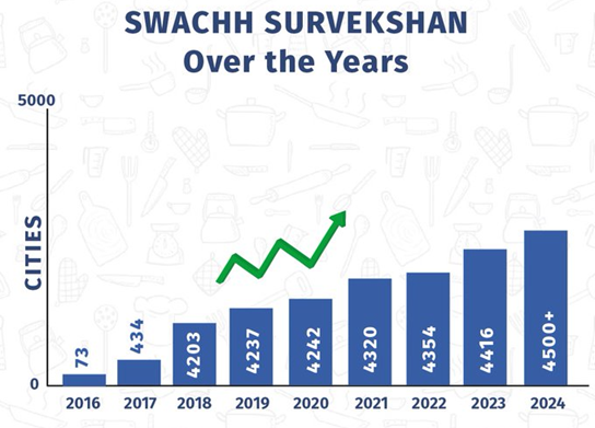- Swachh Survekshan now assesses river towns and coastal areas, expanding beyond Ganga towns.