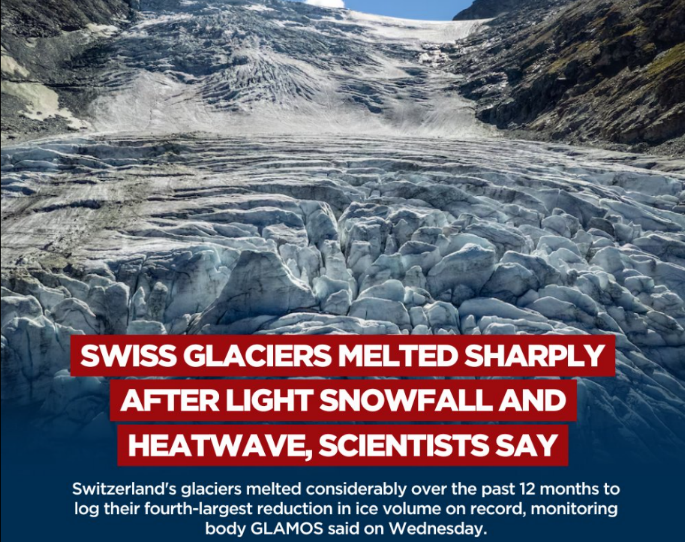 - Swiss glaciers lost 3% of their volume in 2025 due to low snowfall and heatwaves in June and August.