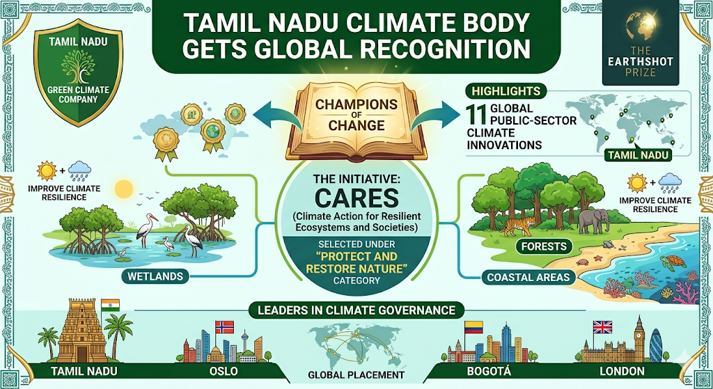 - Tamil Nadu Green Climate Company has been recognised in a global report by The Earthshot Prize.