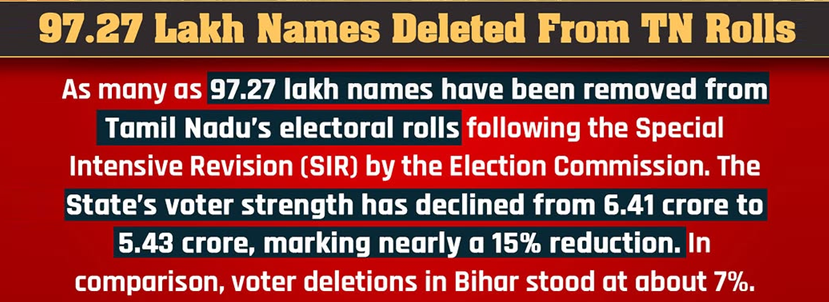 - Over 97 lakh voters were removed from Tamil Nadu’s draft electoral roll after the Special Intensive Revision (SIR).