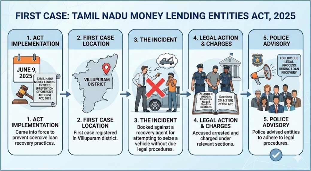 - The first case under the Tamil Nadu Money Lending Entities (Prevention of Coercive Actions) Act, 2025, was registered in Villupuram district.