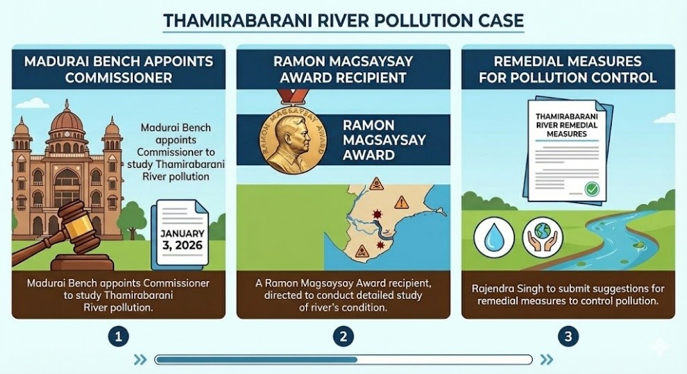 The Madurai Bench of the Madras High Court appointed water conservationist Rajendra Singh as Commissioner to study pollution in the Thamirabarani River.