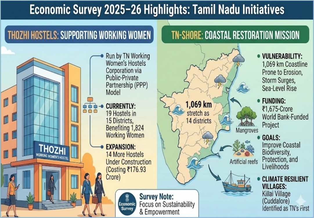 The Economic Survey 2025–26 has highlighted Tamil Nadu’s ‘Thozhi’ working women’s hostels and Tamil Nadu Coastal Restoration Mission (TN-SHORE) coastal restoration mission.