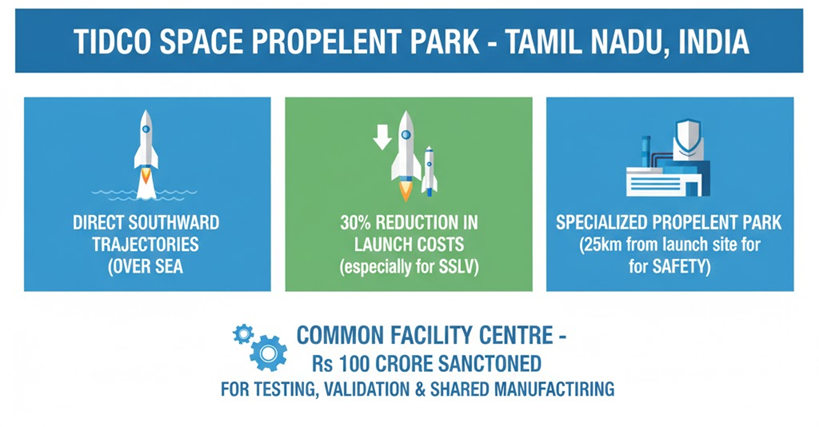- Tamil Nadu is establishing a propellant and space manufacturing zone near the upcoming launch site of ISRO at Kulasekarapattinam.