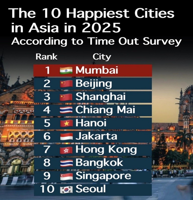 • Mumbai has been ranked the happiest city in Asia in 2025 according to the Time Out City Life Index.