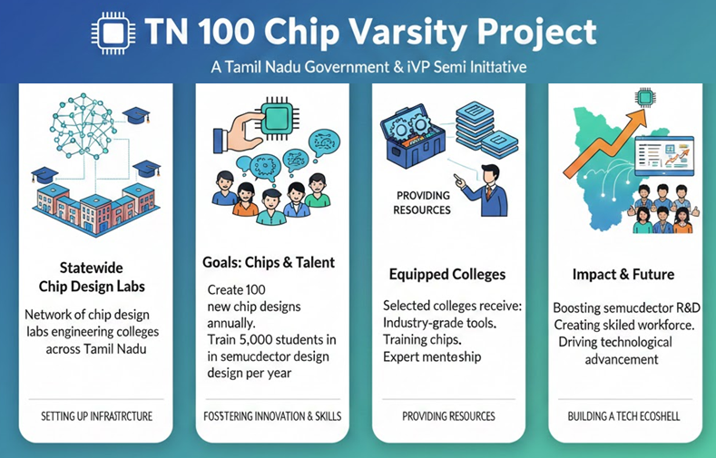 - The Tamil Nadu government and iVP Semi (Integrated Vector Processors Semiconductor) have launched the ‘TN 100 Chip Varsity’ project.