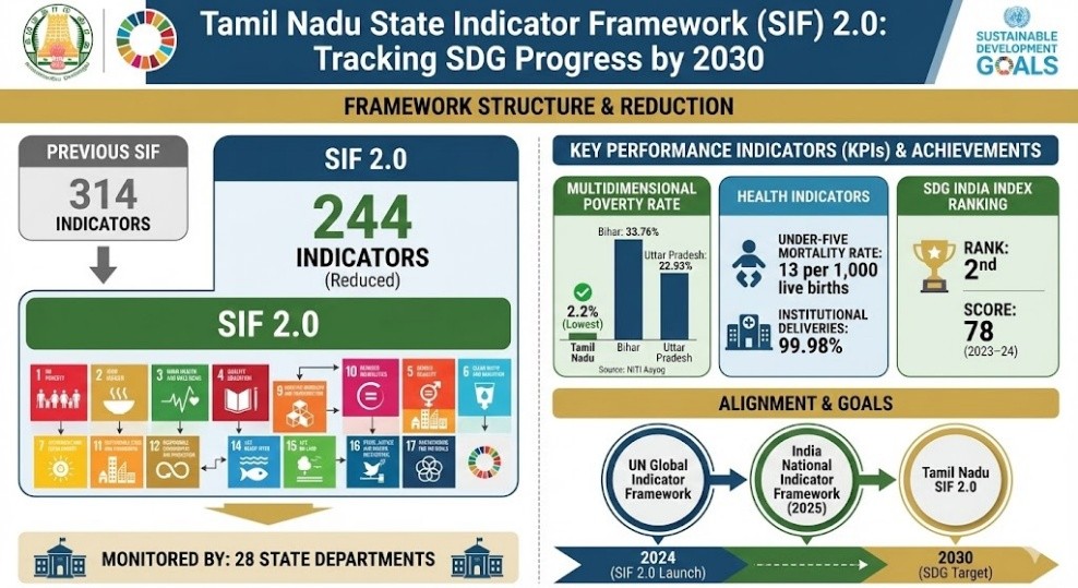 - Tamil Nadu has released the State Indicator Framework (SIF) 2.0 to track progress on the United Nations Sustainable Development Goals (SDGs) by 2030.