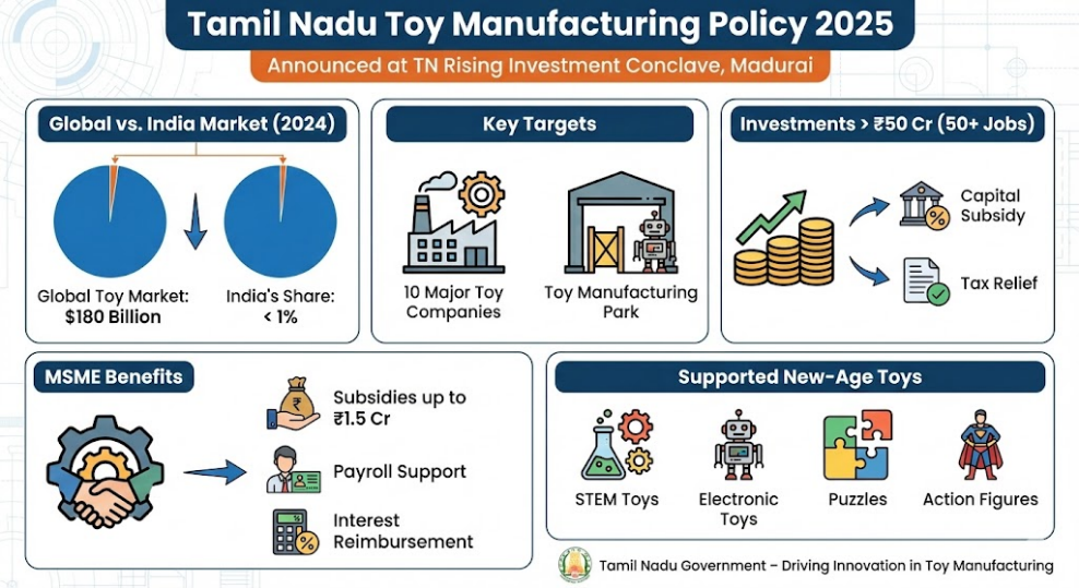 - Tamil Nadu has announced the Toy Manufacturing Policy 2025 at the TN Rising Investment Conclave in Madurai.