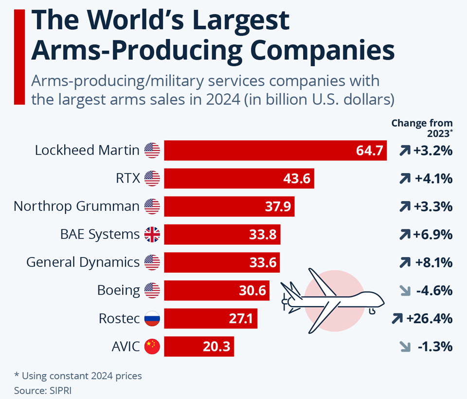 - In 2024, SIPRI (Stockholm International Peace Research Institute) released the Top 100 Arms-Producing and Military Services Companies ranking.