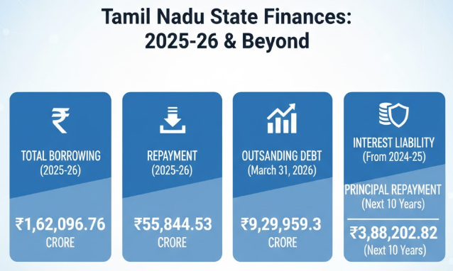 • The Tamil Nadu government plans to borrow a total amount of 1,62,096.76 crore during 2025-26 and make a repayment of 55,844.53 crore.