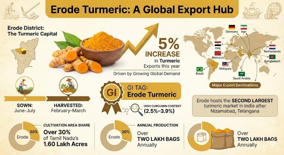 - Turmeric cultivation in Erode covers over 30% of Tamil Nadu’s 1.60 lakh acres under the spice, producing more than two lakh bags annually.