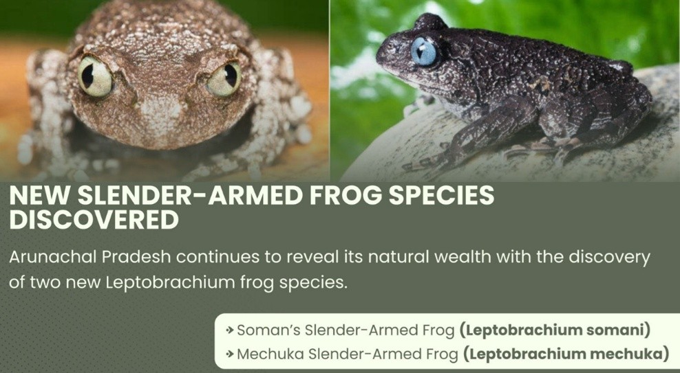 - The newly identified frogs are Soman’s Slender Arm Frog (Leptobrachium soman) and Mechuka Slender Arm Frog (Leptobrachium mechuka).