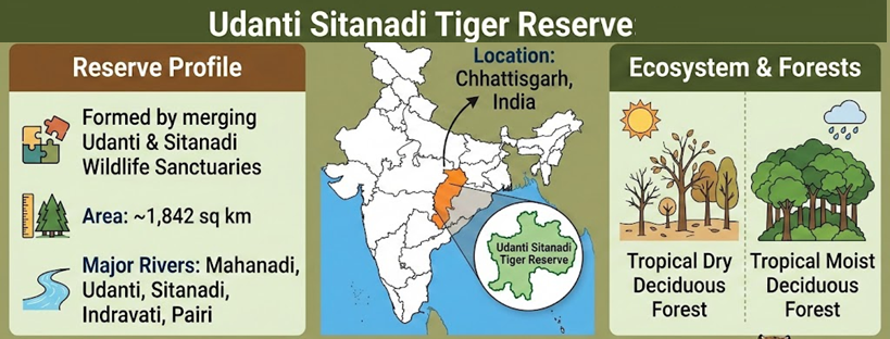 - It was formed by merging Udanti Wildlife Sanctuary and Sitanadi Wildlife Sanctuary.