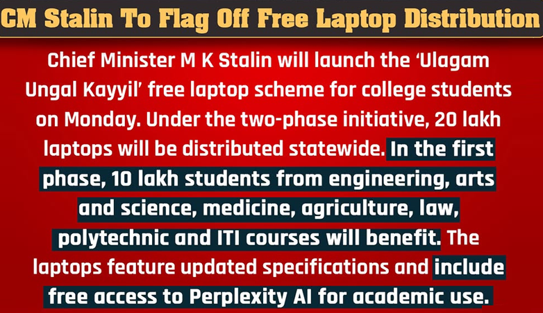 The Tamil Nadu government launched free laptop distribution under the ‘Ulagam Ungal Kaiyil’ initiative in Sivaganga district on 5 January 2026.