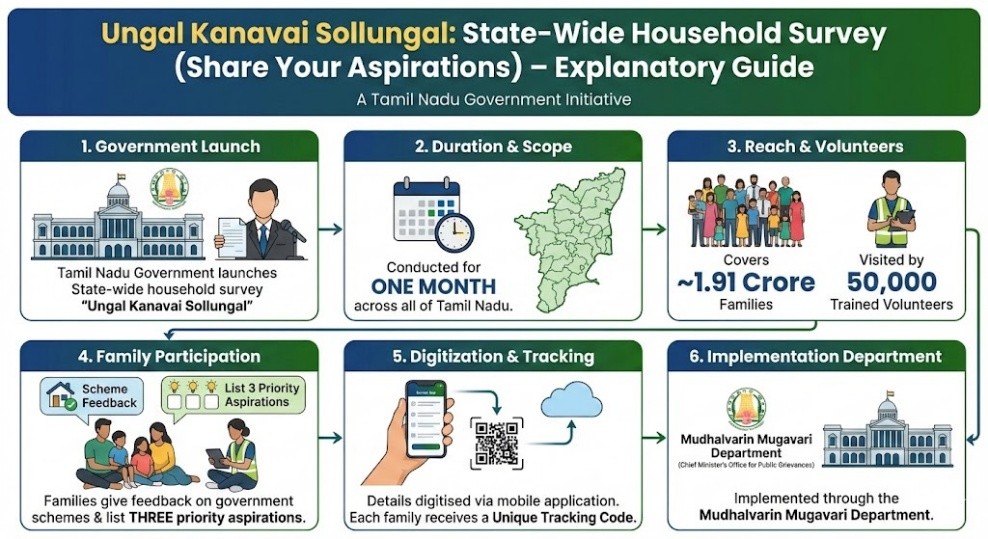 - The Tamil Nadu government is launching a State-wide household survey called Ungal Kanavai Sollungal (Share Your Aspirations).