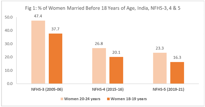 - The prevalence of child marriage in Andhra Pradesh declined from 33% (NFHS-4) to 29.3% (NFHS-5), and in Rajasthan from 35.4% to 25.4%.