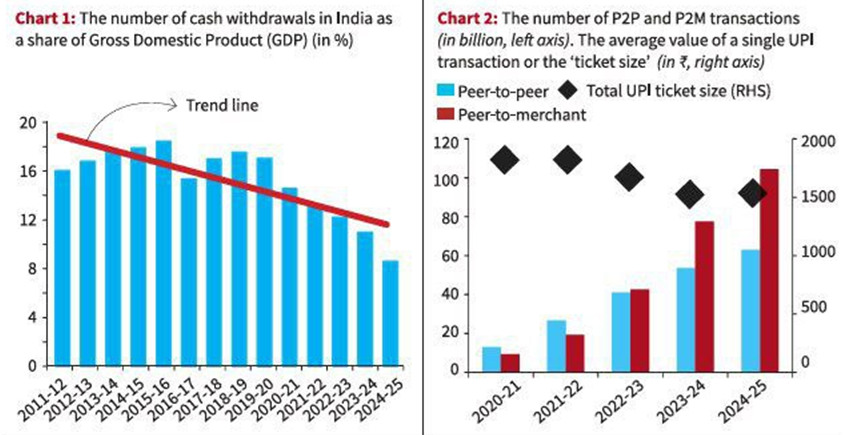 - The rise of UPI is linked to the decline in cash demand, evidenced by a steady fall in ATM cash withdrawals as a percentage of GDP.
