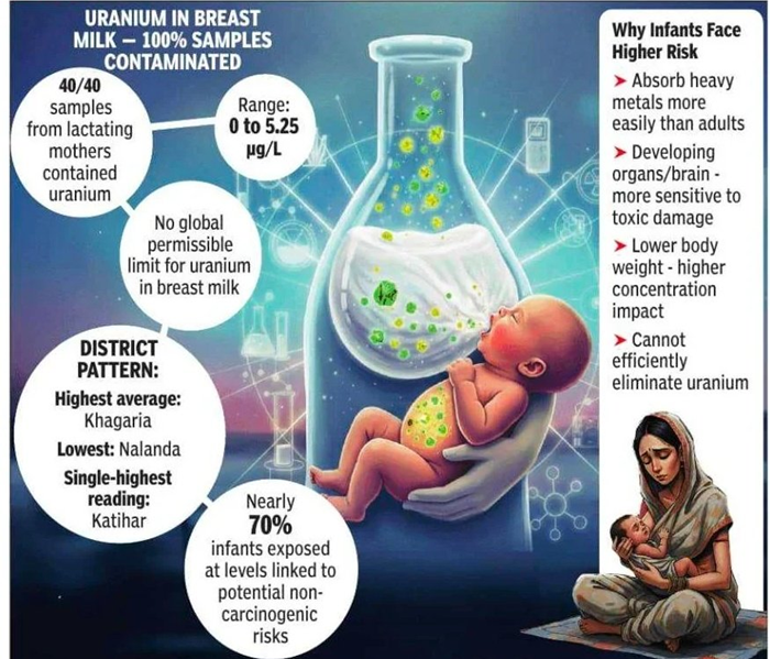 - A study in six Bihar districts found uranium (U-238) in all breastmilk samples collected from 40 mothers.