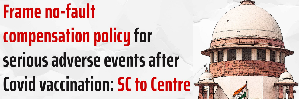 • The Supreme Court of India directed the Union Government to create a “no-fault compensation policy” for people who suffered serious adverse effects or deaths after COVID-19 vaccination.