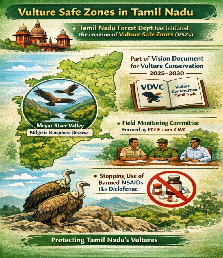 - The Tamil Nadu Forest Department informed the Madras High Court that the process to set up Vulture Safe Zones (VSZs) has started.
