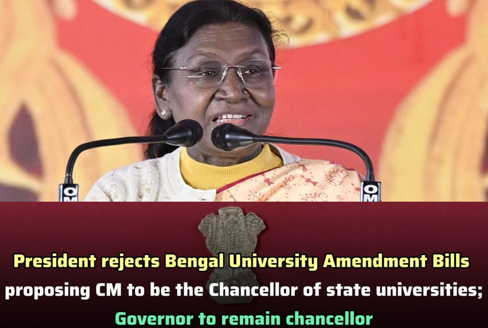 - The President of India rejected the West Bengal Assembly amendment bill proposing the CM as Chancellor of state universities.