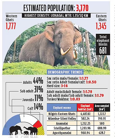- Tamil Nadu recorded 3,170 wild elephants in May 2025, an increase of 107 from the 2024 count of 3,063.
