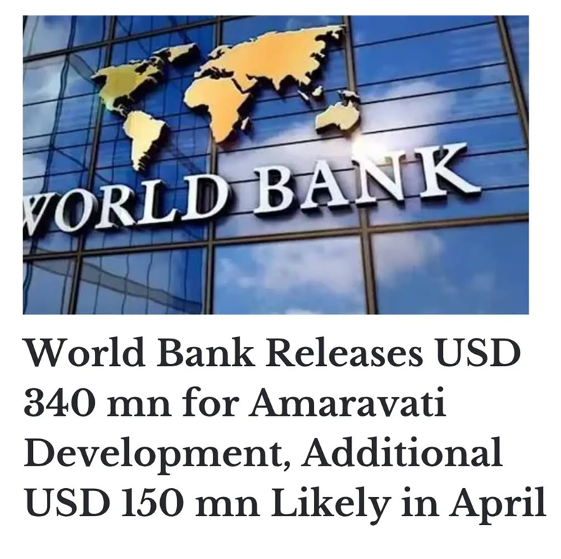 - The World Bank released $340 million for Phase I of Amaravati in Andhra Pradesh.