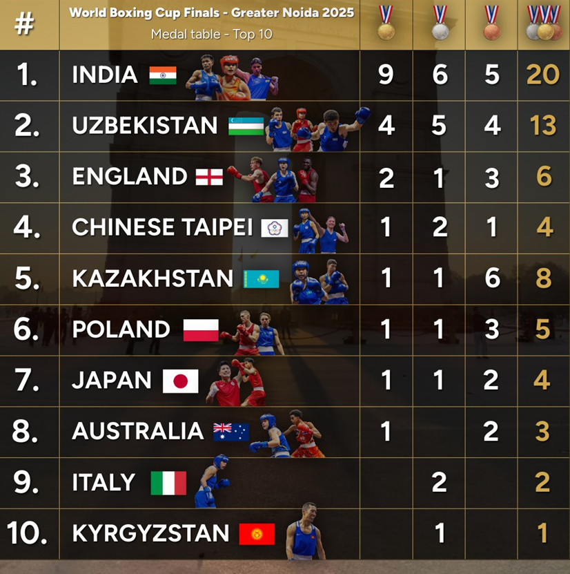 - India emerged as the top nation in the 2025 World Boxing Cup series with 13 golds, followed by Kazakhstan with 12.