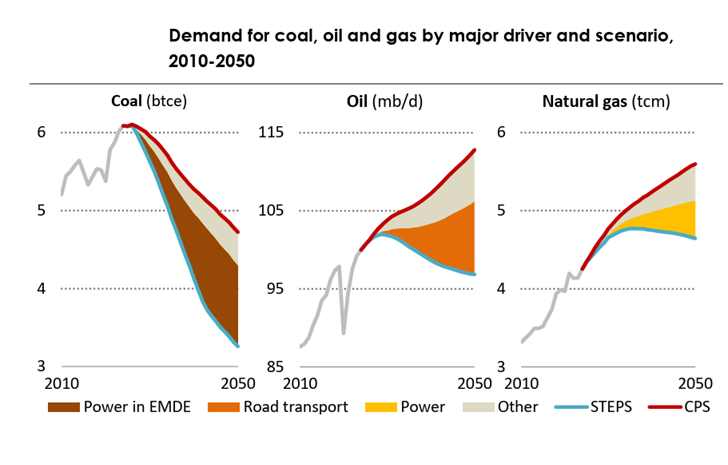 - Under the CPS, oil demand increases to 113 million barrels per day by 2050, and global energy demand rises by 90 exajoules by 2035.