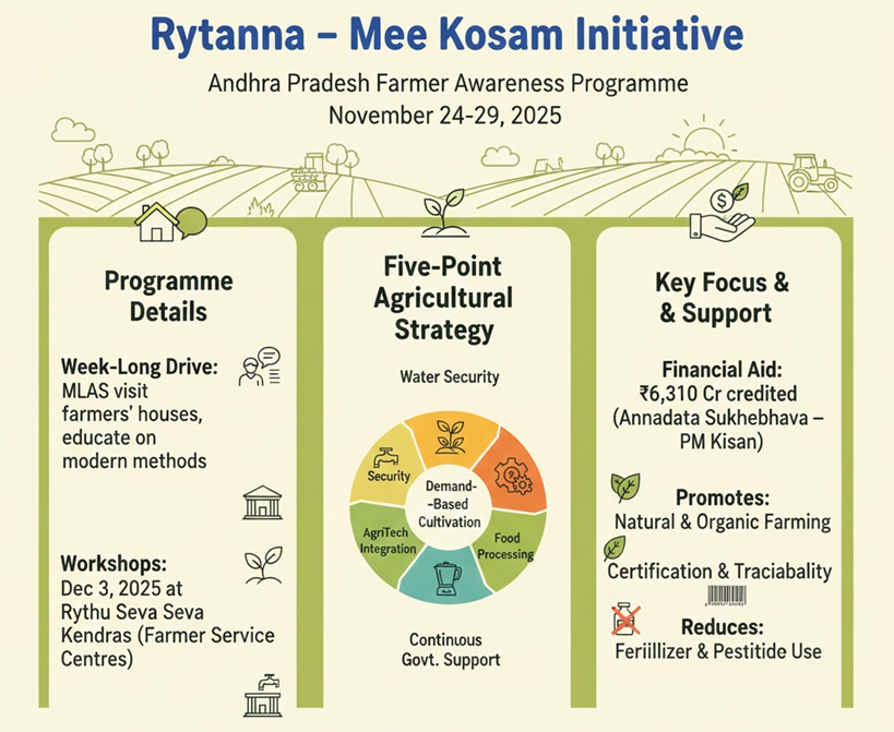Andhra Pradesh is running a week-long farmer awareness programme titled ‘Rytanna – Mee Kosam’ from November 24 to 29, 2025.