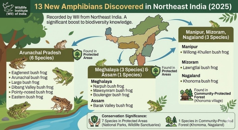 The Wildlife Institute of India (WII) recorded 13 new-to-science amphibian species from northeast India.
