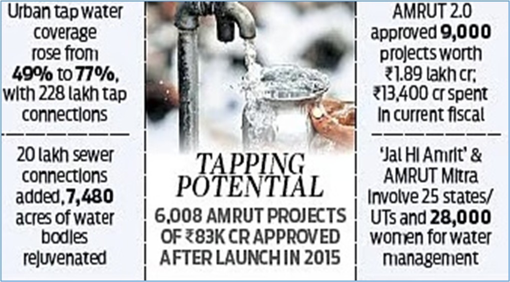 Tap water coverage in urban areas has increased by 64% since 2011 under the Atal Mission for Rejuvenation and Urban Transformation (AMRUT) and AMRUT 2.0.