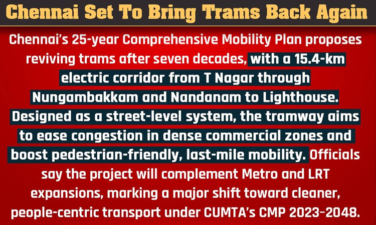 The Comprehensive Mobility Plan (CMP) for Chennai identified future corridors for Metro Rail, LRT (Light Rail Transit), RRTS (Regional Rapid Transit System), and a tram line.