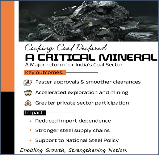 • The Government of India has notified Coking Coal as a Critical and Strategic Mineral under the MMDR Act, 1957 (Mines and Minerals Development and Regulation Act).