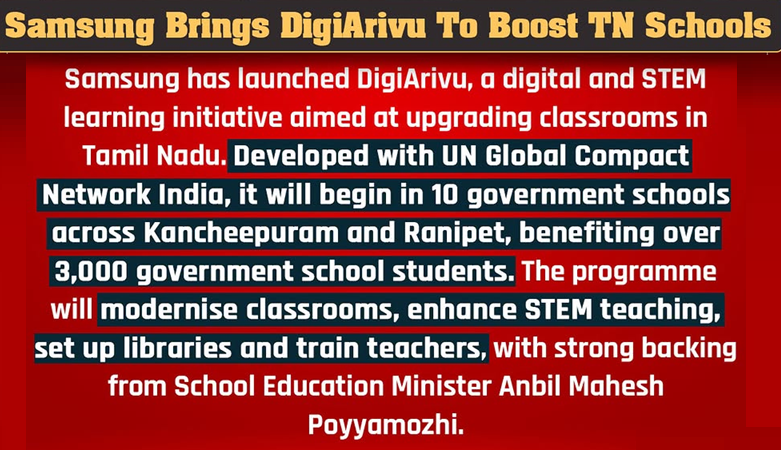 - Samsung will upgrade the infrastructure in 10 government schools in Kancheepuram and Ranipet districts.