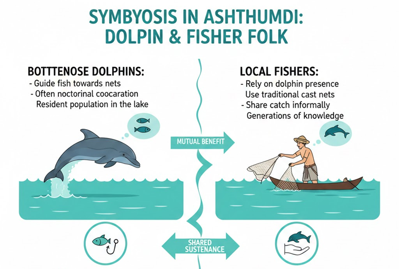 • The study aims to study the cooperative fishing behaviour (mutualism) between Indo-Pacific humpback dolphins and fishers in Ashtamudi Lake, Kerala.