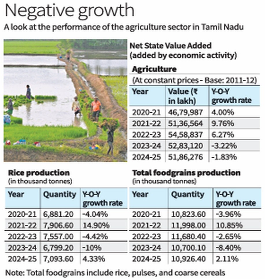 • Agriculture is the weak spot of Tamil Nadu’s economy and has recorded negative growth in the last two years, 2023–24 and 2024–25.