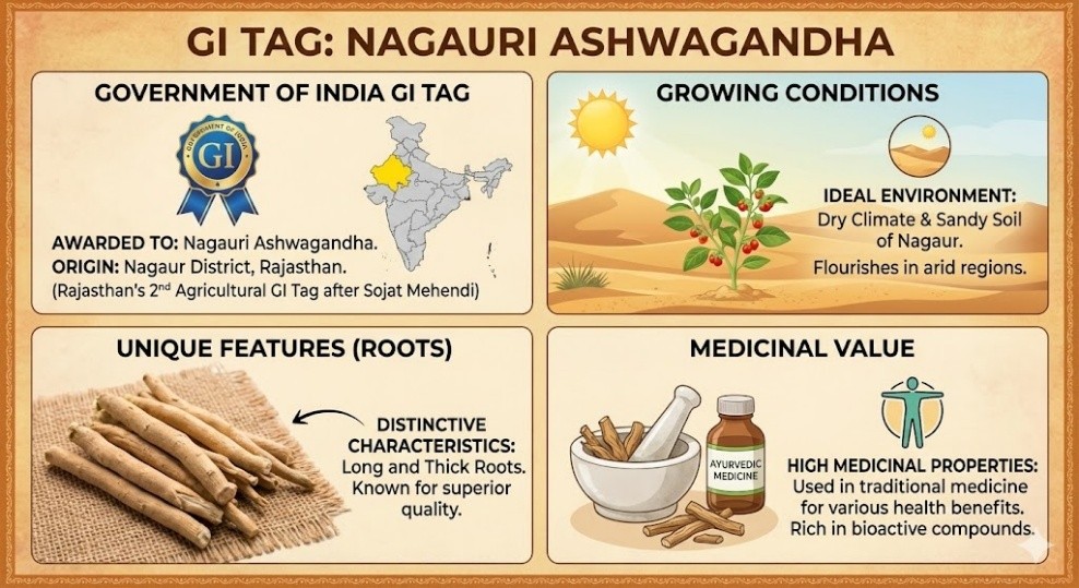 - The Government of India has given the GI tag to Nagauri Ashwagandha from Nagaur district in Rajasthan.