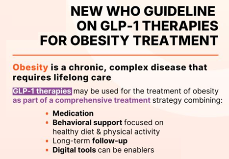The WHO released global guidelines endorsing GLP-1 therapies for long-term treatment of obesity in adults, excluding pregnant women.