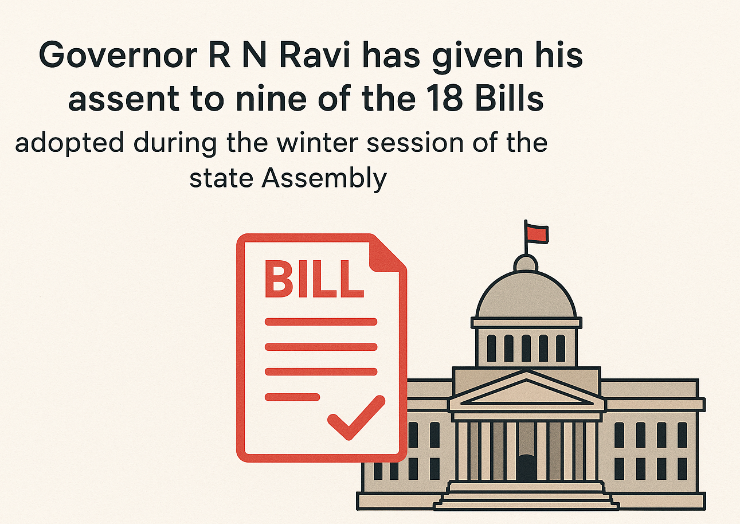 • Governor R N Ravi has given his assent to nine of the 18 Bills adopted during the winter session of the state Assembly.