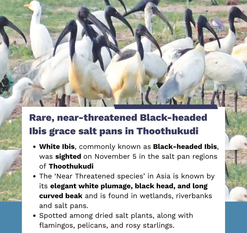 - A flock of Black-headed Ibis (Threskiornis melanocephalus) was spotted in the salt pans of Thoothukudi, Tamil Nadu.